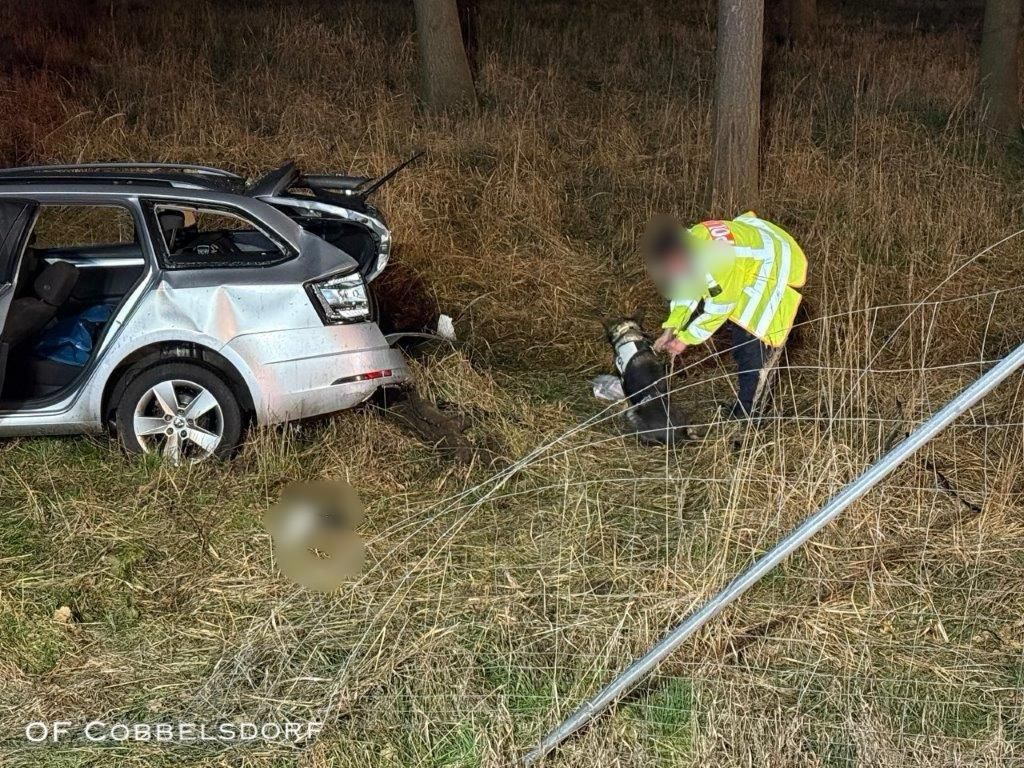 PKW von Fahrbahn abgekommen - Sicherung Einsatzstelle, Unterstützung Rettungsdienst, abklemmen Fahrzeugbatterie