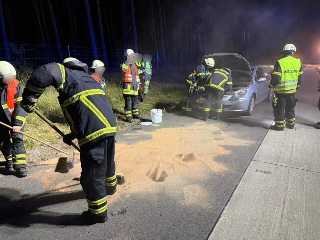 VKU 3 PKW auf linker Fahrspur - Absicherung Einsatzstelle, Abstumpfen + Abbinden auslaufender Betriebsstoffe, Reinigung Fahrbahn, abklemmen Fahrzeugbatterie